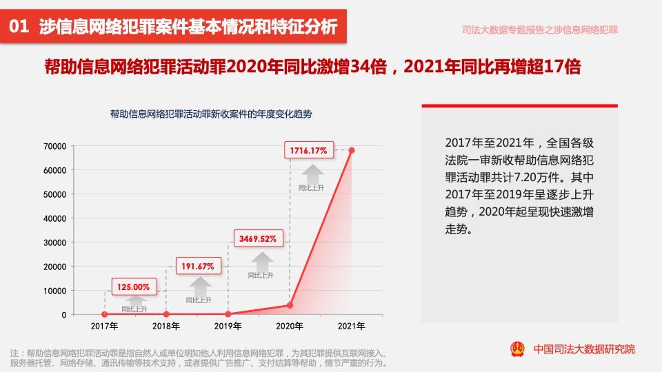 五年來(lái),全國各級法院一審新收幫助信息網(wǎng)絡(luò )犯罪活動(dòng)罪共計7.20萬(wàn)件。其中2017年至2019年呈逐步上升趨勢,2020年起呈現快速激增走勢,2020年同比增長(cháng)34倍,2021年同比再增超17倍。